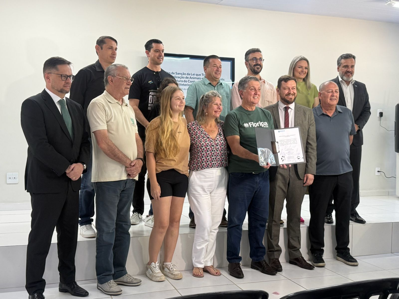 O ato de assinatura contou ainda com a presença dos vereadores Diácono Ricardo e Pastor Giliard Torquato, além do chefe de gabinete do deputado estadual Júlio Garcia, Carlos Eduardo de Souza Neves, o Mamute, secretário de saúde Almir Adir Gentil, secretário adjunto de saúde Humberto João dos Santos, secretário da Casa Civil da Prefeitura de Florianópolis Thiago Oliveira, secretária de licitações Katherine Schreiner, diretora de vigilância em saúde Lani Martinello dos Santos e demais autoridades locais que reforçaram o compromisso coletivo com a causa animal.