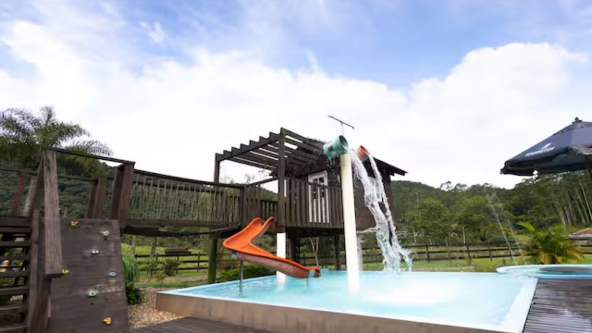 Uma propriedade rural localizada em Pomerode, cidade conhecida como a mais alemã do Brasil, no interior de Santa Catarina, está se consolidando como uma das opções de hospedagem mais procuradas para quem busca lazer e tranquilidade durante a temporada de verão, longe das praias movimentadas do litoral. O atrativo principal, um mini parque aquático projetado especialmente para o público infantil, tem feito do local um dos preferidos entre os hóspedes da plataforma Airbnb na região.