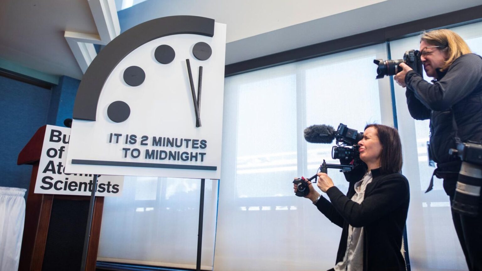 O Boletim dos Cientistas Atômicos, organização sem fins lucrativos com sede em Chicago, justificou a diminuição de 4 segundos do tempo para a meia-noite com base na postura cada vez mais agressiva das potências nucleares, casos de Rússia, China e Estados Unidos. Além disso, pesou o enfraquecimento dos mecanismos internacionais de controle.