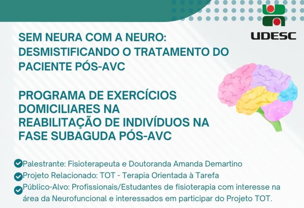A palestra será ministrada pela fisioterapeuta Amanda Demartino, que é doutoranda do Programa de Pós-Graduação em Fisioterapia da Udesc Cefid (PPGFT) e integrante do Ladecom, e abordará o Programa de Exercícios Domiciliares na Reabilitação de Indivíduos na Fase Subaguda Pós-AVC.