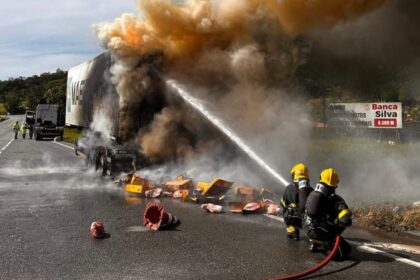 Caminhão Com Carga de Carne Incendeia Na Br-101 em Sc e É Alvo de Saque Durante Combate Às Chamas